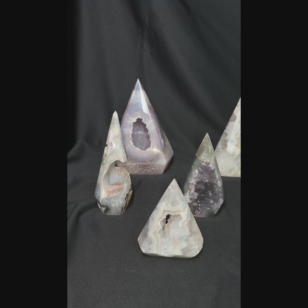 This 9-piece Agate Diamonds lot from Rio Grande do Sul, Brazil showcases a perfect blend of color, texture, and polish. Each piece features natural druzy crystal cores surrounded by vibrant agate banding, expertly shaped into polished diamond forms that reflect light beautifully — an ideal choice for retailers who value visual sophistication and easy display.