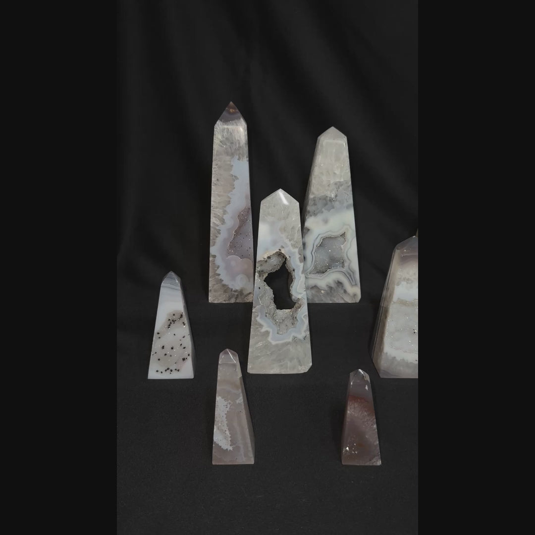 This 14-piece Agate Obelisks lot from Rio Grande do Sul, Brazil combines natural color variety with refined polish and elegant form. Each obelisk reveals vibrant druzy inclusions framed by agate’s signature banding — polished to a glossy, light-reflective finish that enhances both visual appeal and perceived value on display.