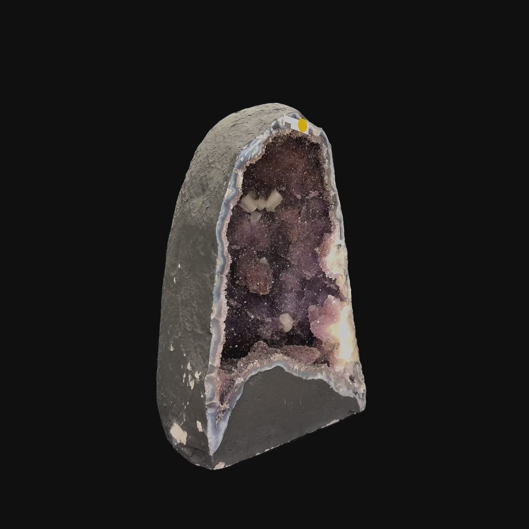 This unique amethyst cathedral features a richly textured interior of violet crystal points, enhanced by striking agate banding along the edges and rare calcite inclusions within the geode. The interplay of minerals creates a sophisticated balance of color, texture, and depth, making it an exceptional display specimen.