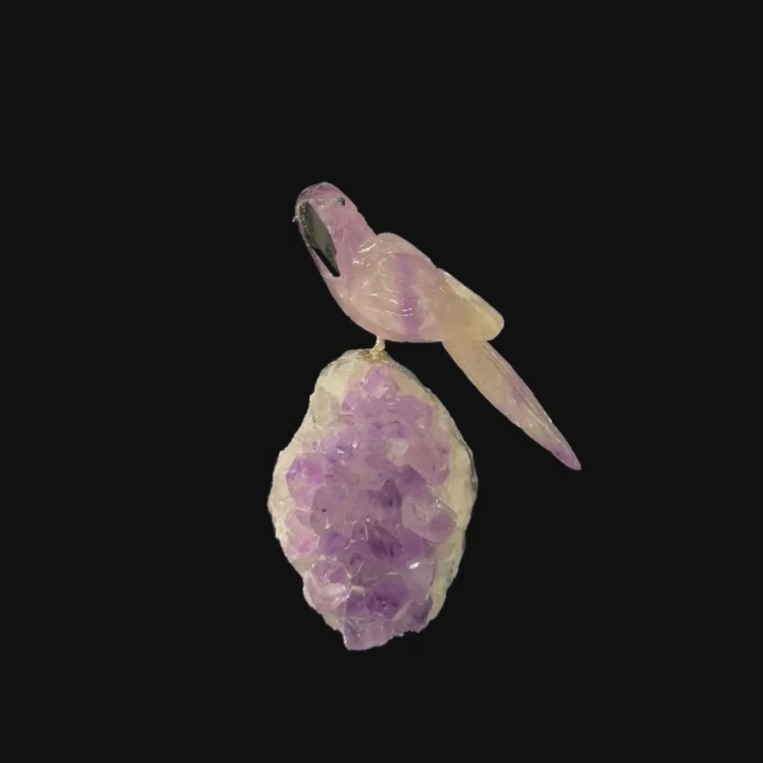 This parrot carving is beautifully sculpted from amethyst, showcasing the rich purple hues that naturally radiate from the crystal. Without a crown, the parrot’s detailed form stands gracefully atop a cutbase of amethyst, giving the piece an elegant and grounded presence.