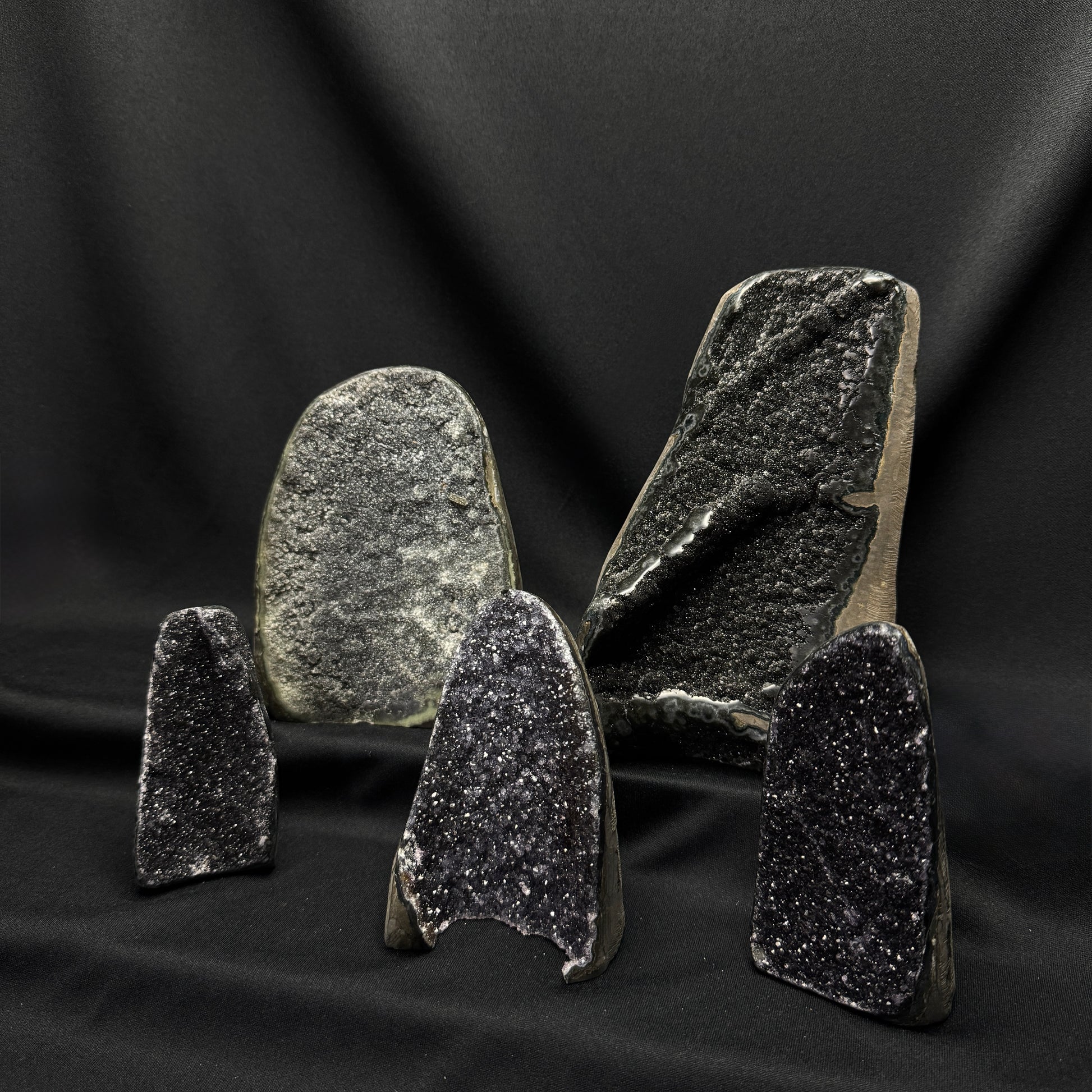 Upgrade your wholesale inventory with this Black Amethyst cut-base lot from Rio Grande do Sul, Brazil. Each specimen showcases a dense crystal surface with metallic sparkle and deep tonal contrast — combining elegant visual appeal with stable, polished bases ideal for retail presentation.
