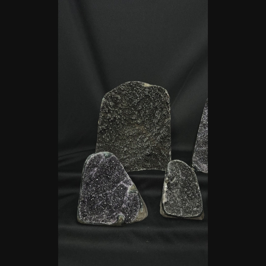 Enhance your crystal inventory with this 6-piece Black Amethyst cut-base lot from Rio Grande do Sul, Brazil. Each piece features deep charcoal-to-black crystals with natural sparkle and metallic luster. The polished cut base provides stability for upright display, ideal for both retail shelves and photo-ready merchandising.
