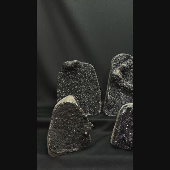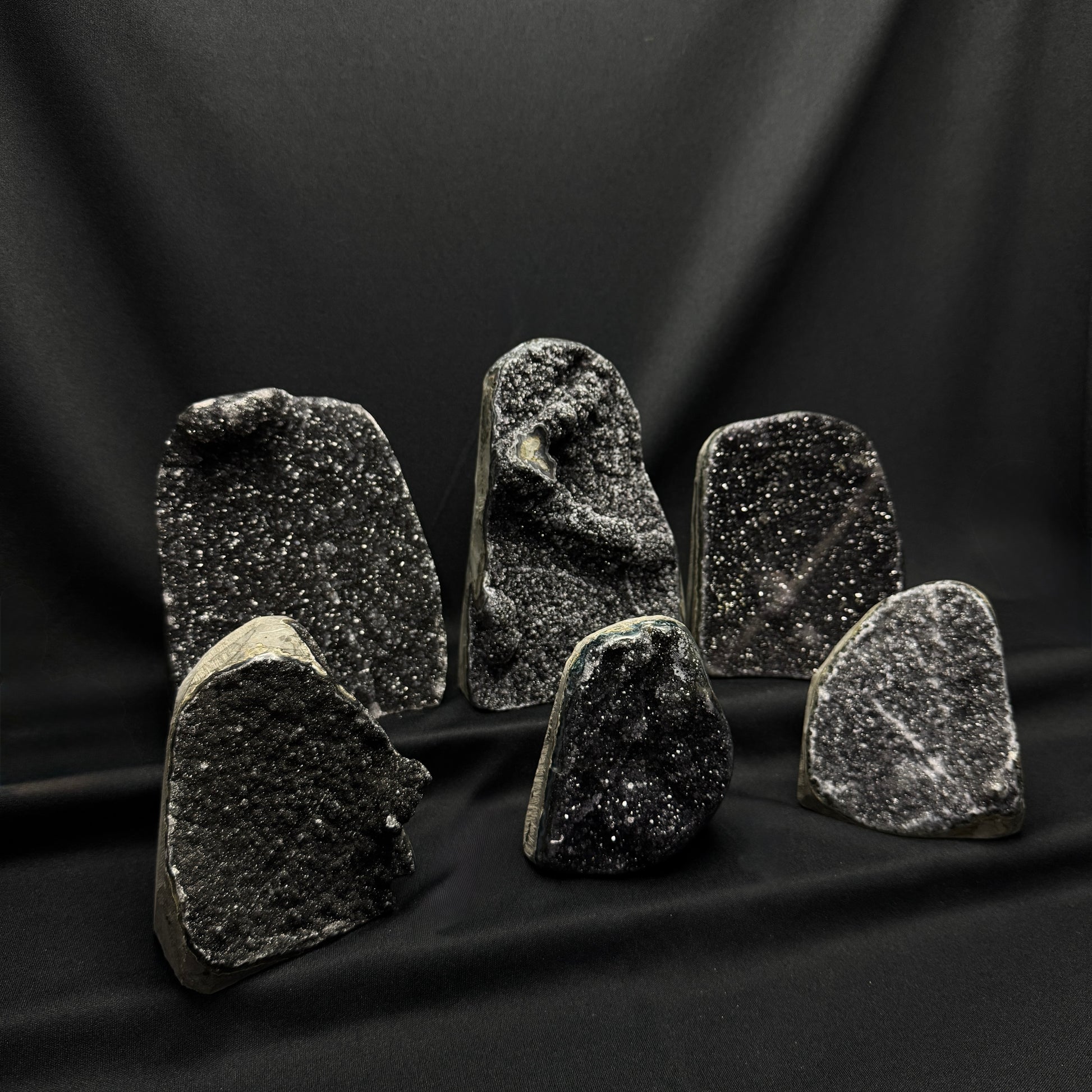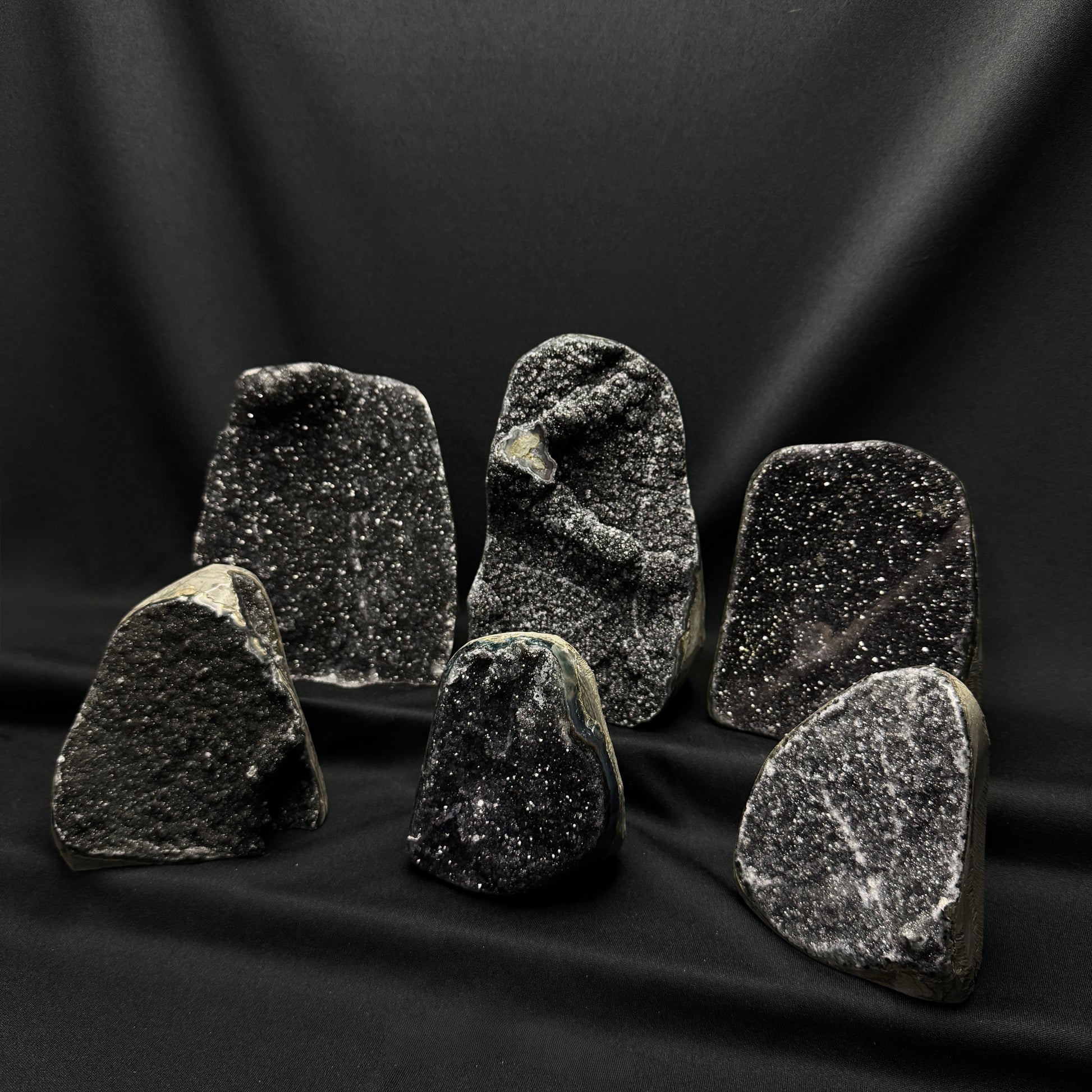 This 6-piece Black Amethyst cut-base lot from Rio Grande do Sul, Brazil brings refined contrast and natural brilliance to any wholesale selection. Each piece features deep charcoal-to-black crystal clusters with metallic sparkle and a polished flat base — combining bold visual presence with professional display quality.