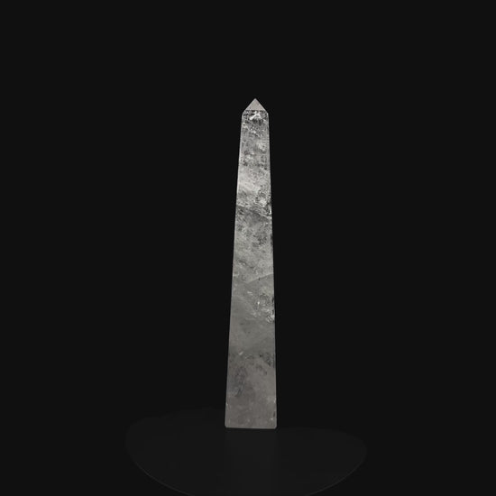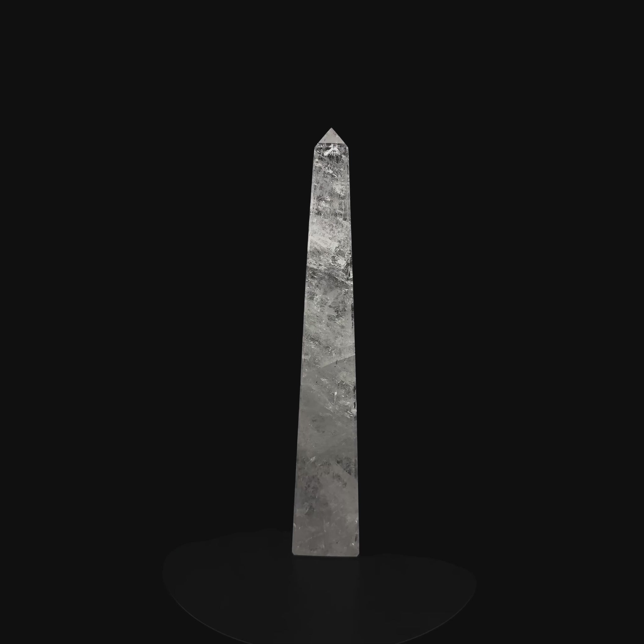 This clear quartz obelisk stands 28 cm tall, showcasing the clarity and natural beauty of Brazilian clear quartz. The smooth, polished surface highlights the crystal’s transparency and unique internal formations, making it a refined addition to any collection or décor setting.
