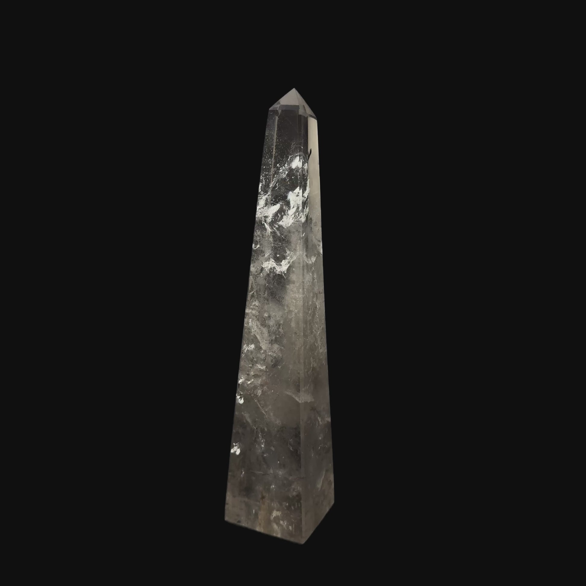 This clear quartz obelisk stands at 29 cm tall, featuring the exceptional clarity and natural elegance of Brazilian clear quartz. The smooth surface of the obelisk highlights its transparency and showcases its subtle internal inclusions, creating a refined, luminous piece perfect for display.