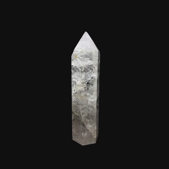 This clear quartz point stands 26 cm tall, showcasing the natural clarity and brilliance of Brazilian clear quartz. Its tapered shape and polished facets highlight the crystal’s internal structures, creating a luminous and elegant display piece.