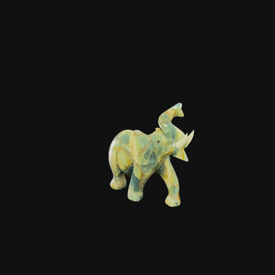 This beautifully hand-carved elephant is crafted from blue onyx, showcasing the natural veining and rich blue tones of the stone. The elephant’s graceful stance and finely detailed features capture the strength and wisdom typically associated with this majestic animal.
