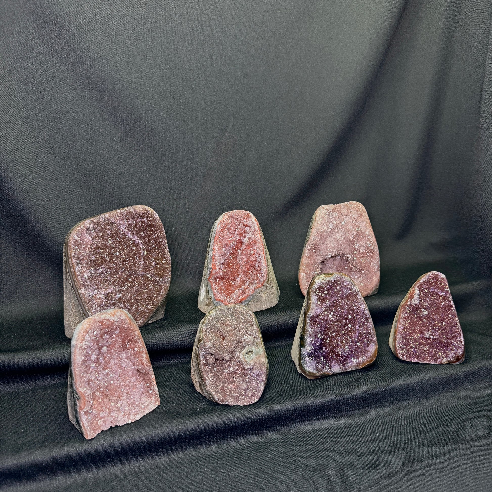 This 7-piece Rainbow Amethyst cut-base lot from Rio Grande do Sul, Brazil features lively tones and a brilliant natural sparkle that instantly attracts attention. Each piece reveals vivid color transitions—from lilac and rose to soft green and deep violet—making it a standout choice for visually engaging retail displays.