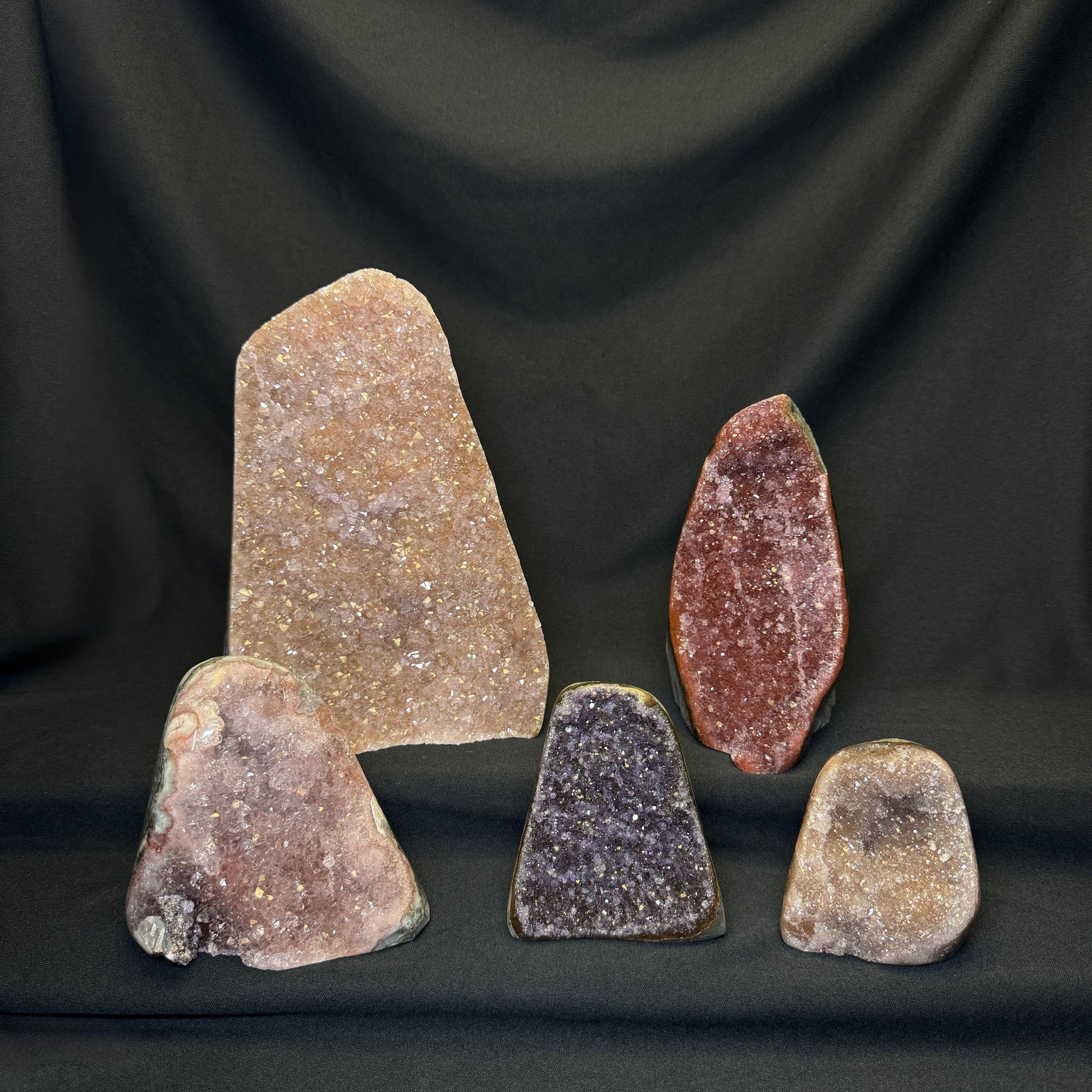 This 5-piece Rainbow Amethyst cut-base lot from Rio Grande do Sul, Brazil delivers striking color transitions and high visual impact. Each piece features vivid hues—from soft lilac and rose to deep violet and green—enhanced by a radiant natural sparkle and smooth polished base. A perfect choice for retailers seeking show-stopping yet versatile inventory.