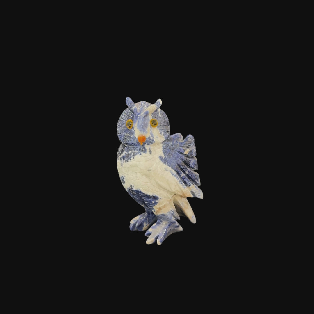 This finely detailed animal carving depicts an owl sculpted from premium Brazilian sodalite, featuring deep navy-blue tones streaked with natural white marbling. The artisan work captures the owl’s wise expression and intricate feather detailing, blending realism with the inherent beauty of the stone.