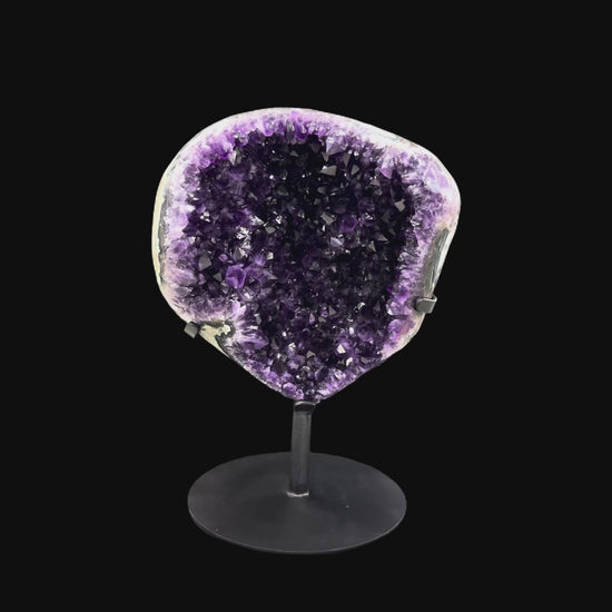 This extra‑quality Uruguayan amethyst presents a dense field of sharply terminated crystals with exceptional luster and saturated violet tones. Mounted on a refined circular metal stand, the piece balances sculptural presence with a clean, gallery‑style silhouette, allowing light to move across the tightly clustered points and reveal subtle color zoning from deep plum to lavender.